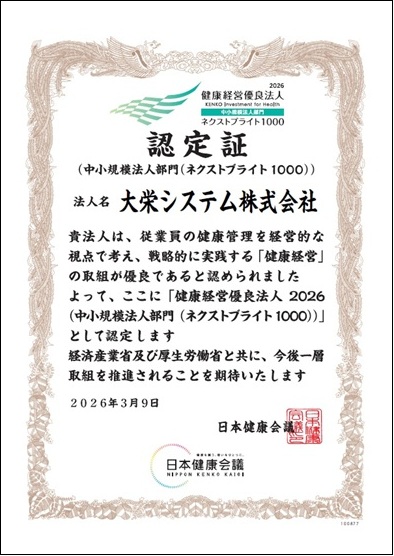 大栄システム株式会社は2026年3月9日、健康経営に関する各種取り組みが評価され、経済産業省と日本健康会議が共同で実施する「健康経営優良法人認定制度」において、「健康経営優良法人2026(中小規模法人部門)」に認定されました。2018年より9年連続の認定となります。