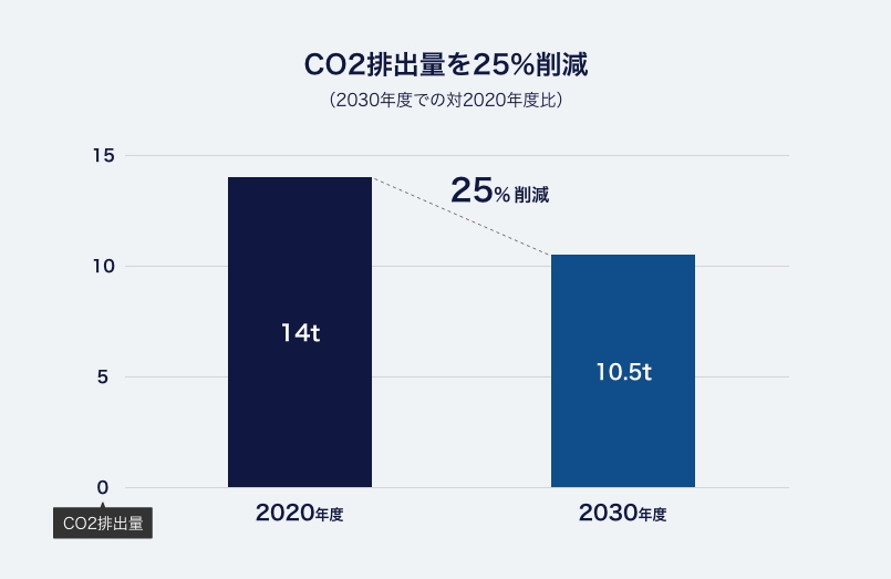 弊社の温室効果ガス排出量(Scope1+2)を毎年2.5%削減、2030年度には対2020年度比25%削減を目指します。